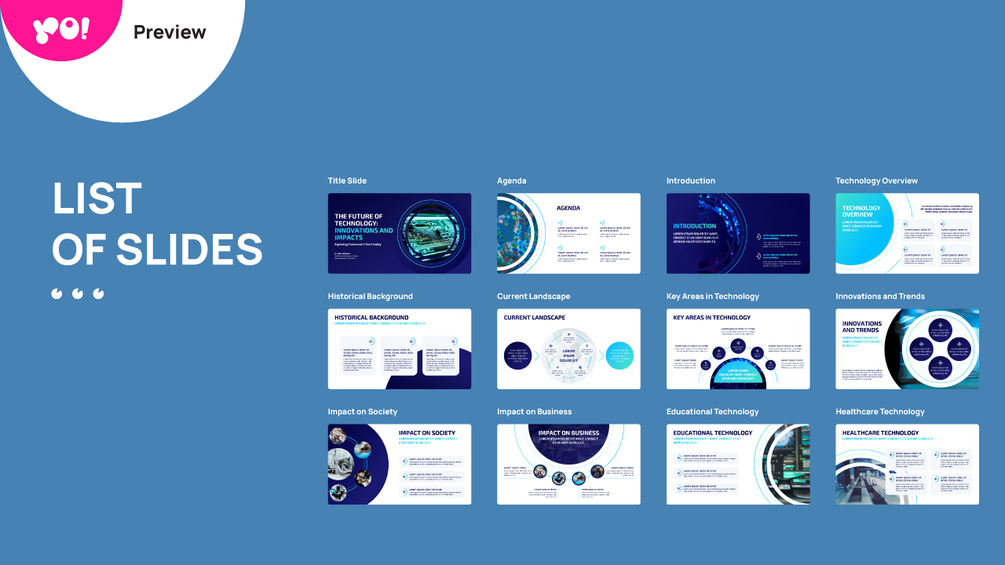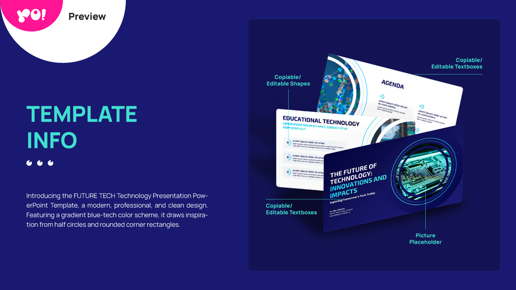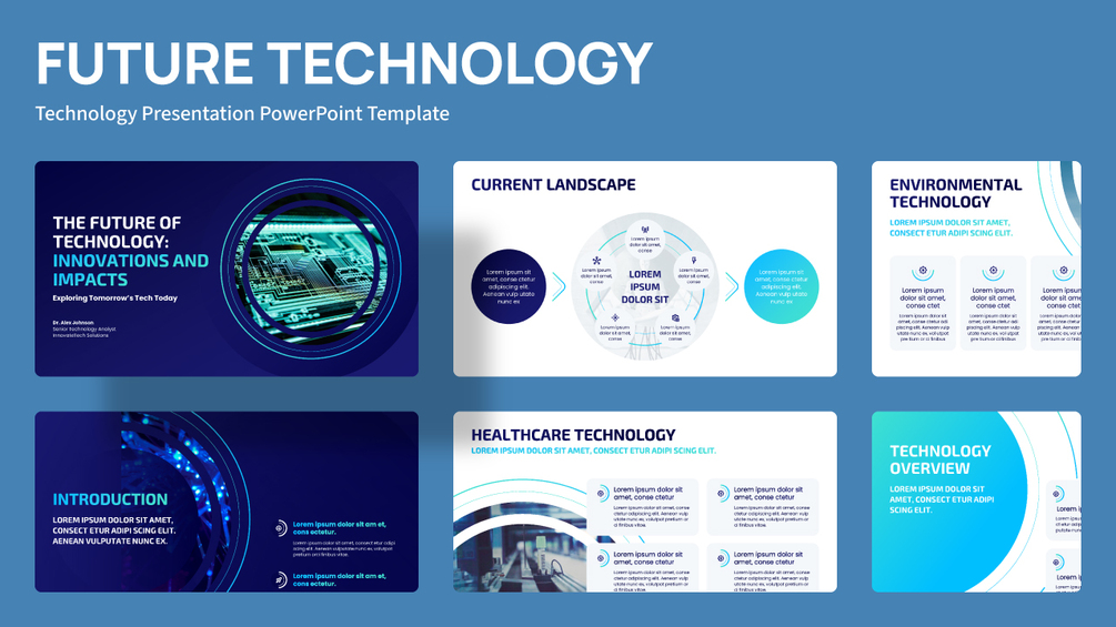 Introducing the FUTURE TECH Technology Presentation PowerPoint Template, a modern, professional, and clean design. Featuring a gradient blue-tech color scheme, it draws inspiration from half circles and rounded corner rectangles.
